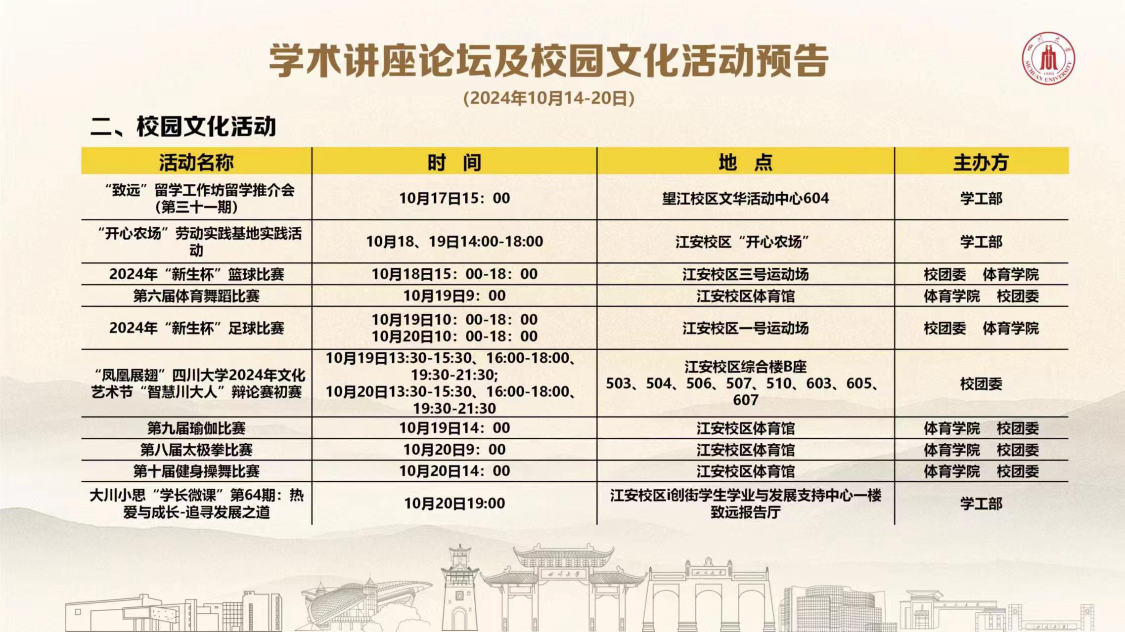 色漫网 2024年10月14日-20日学术讲座论坛及校园文化活动预告