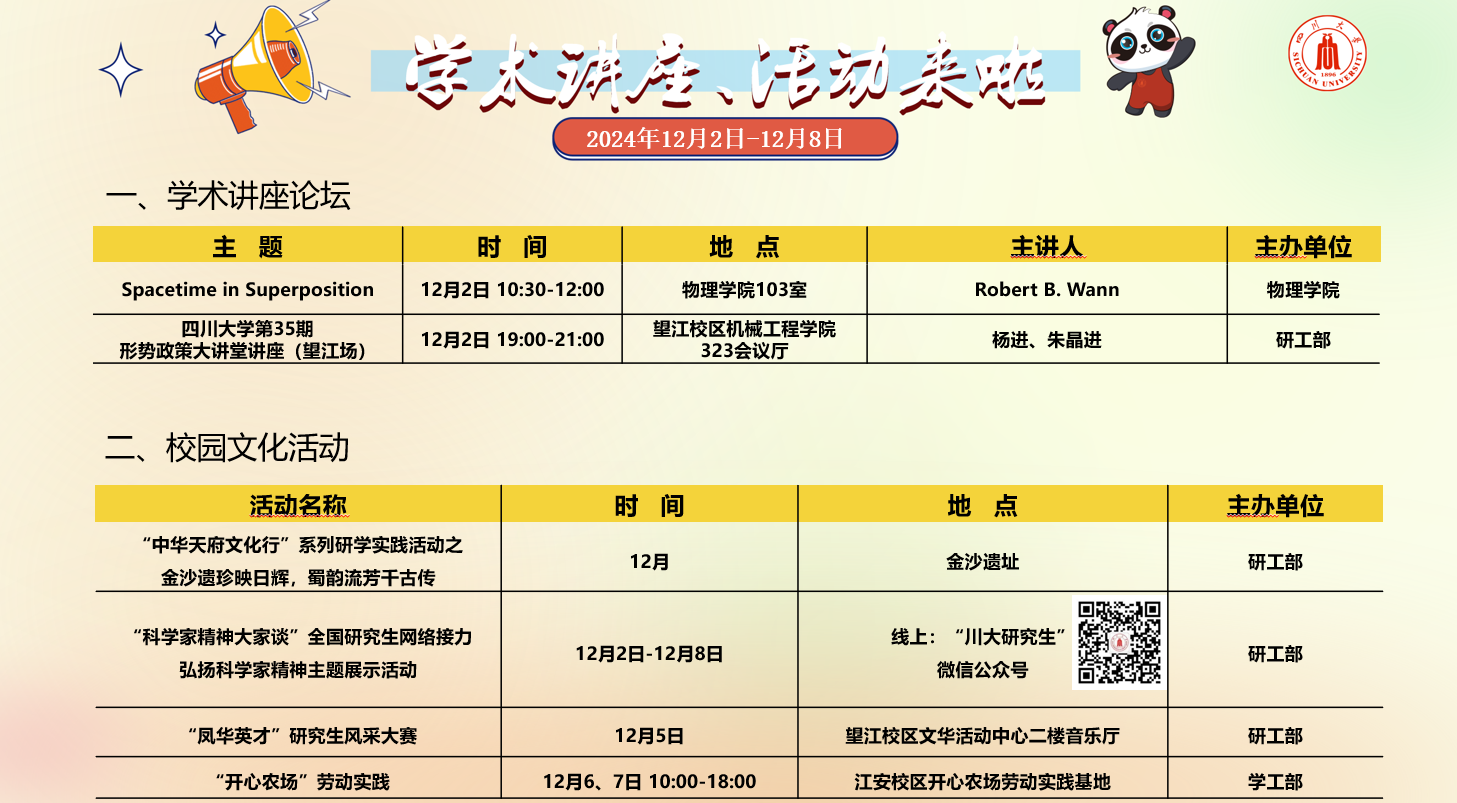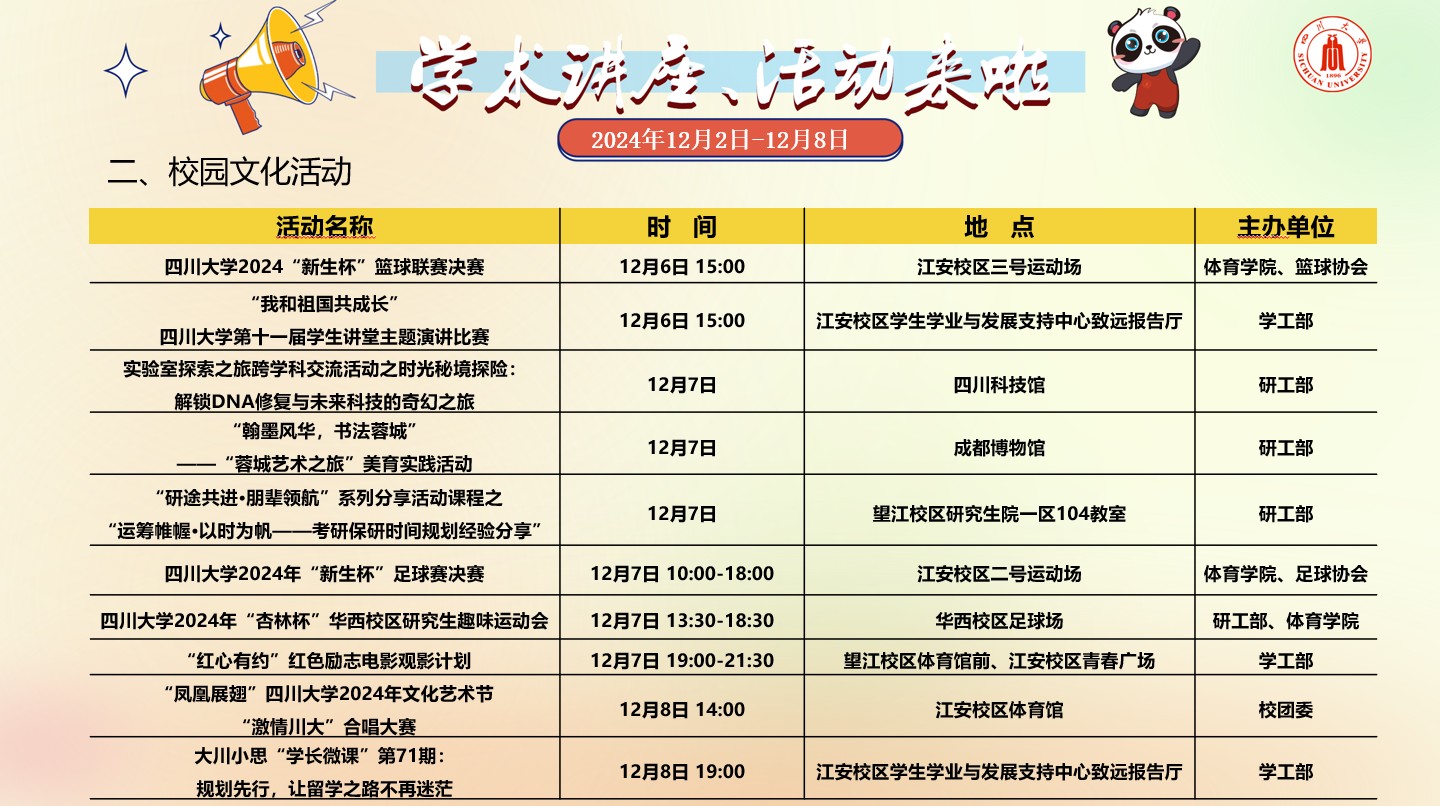 色漫网 2024年12月2日-12月8日讲座及校园文化预告