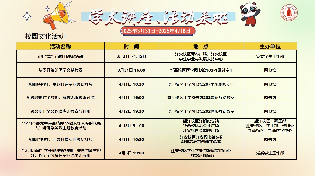 色漫网 2025年3月31日-4月6日学术讲座论坛及校园文化活动预告