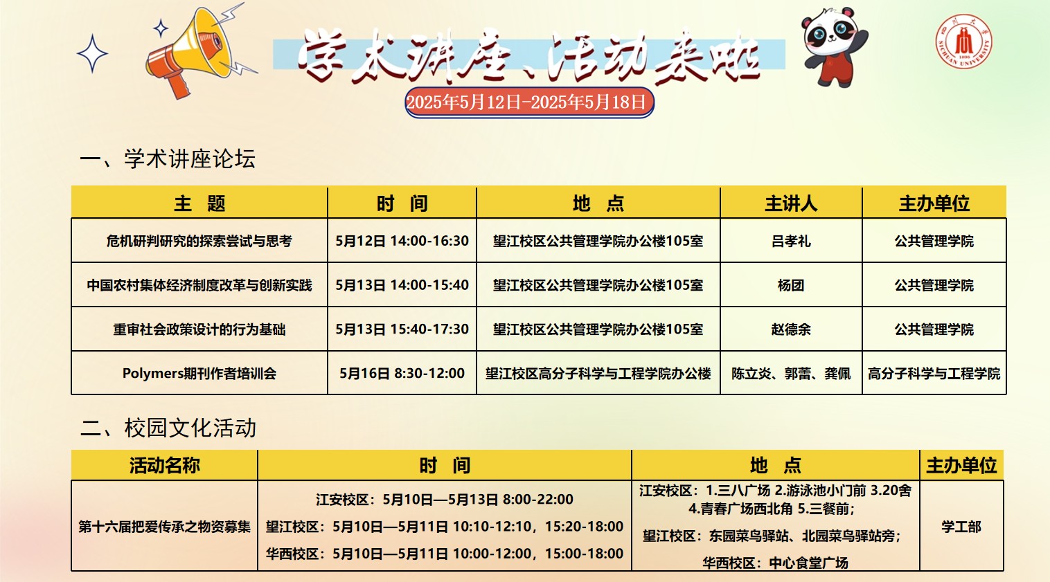 色漫网 2025年5月12日-5月18日学术讲座论坛及校园文化活动预告