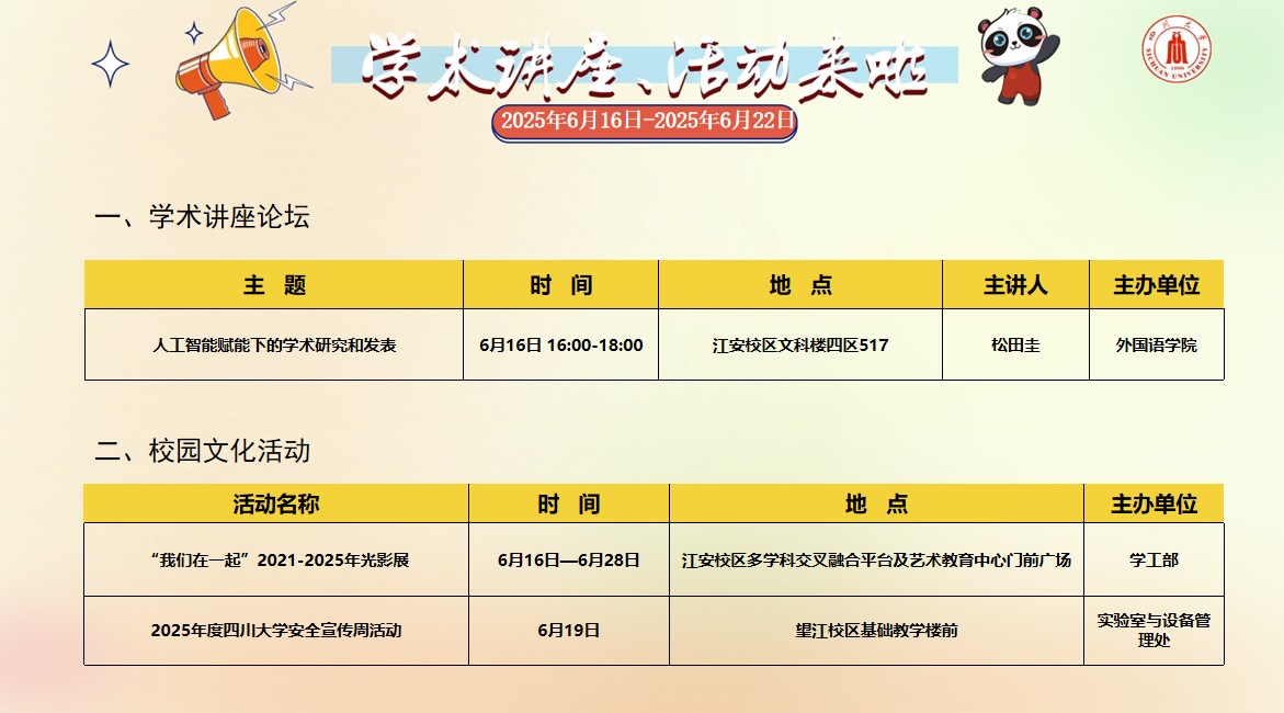 色漫网 2025年6月16日-6月22日学术讲座论坛及校园文化活动预告