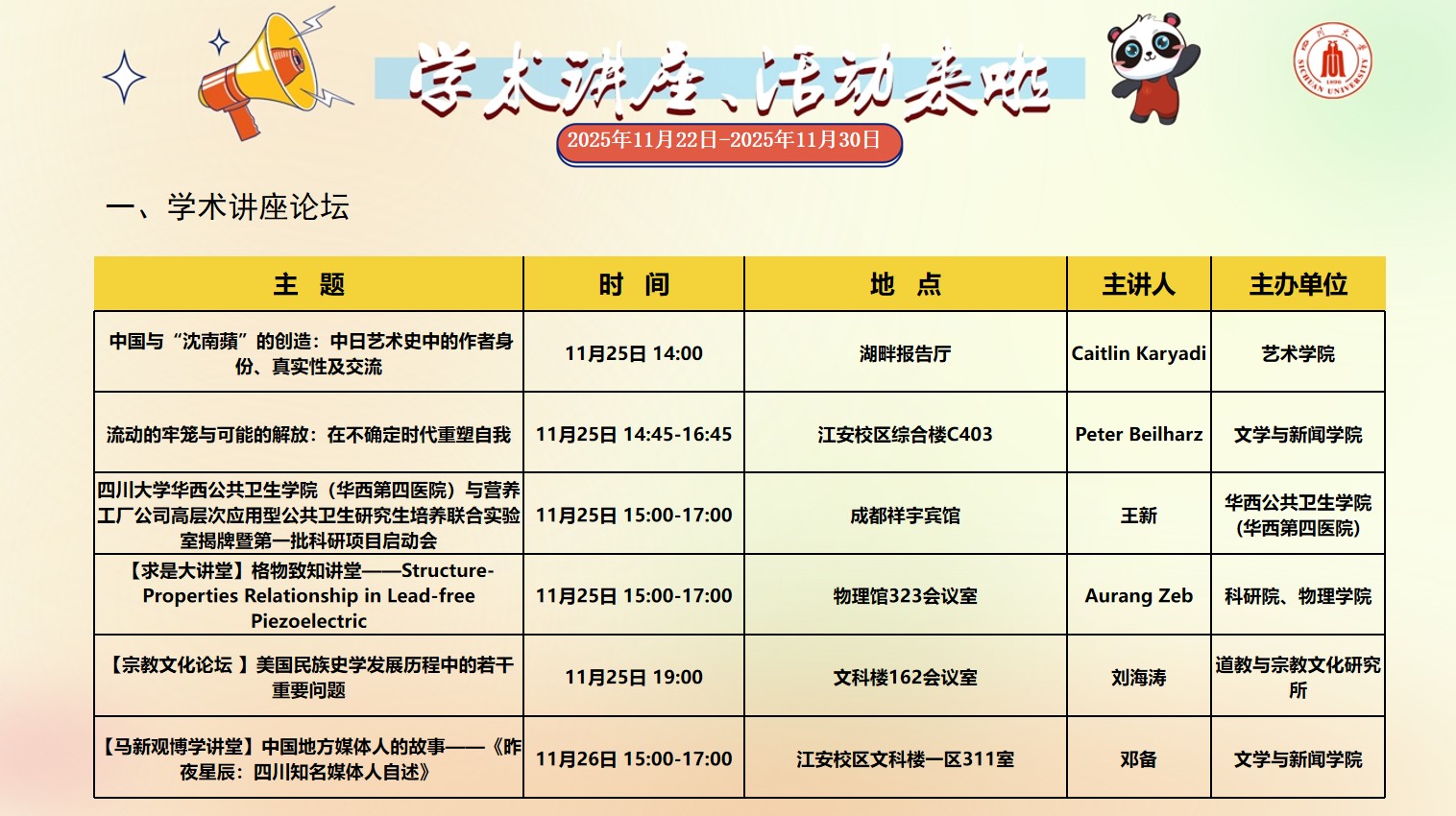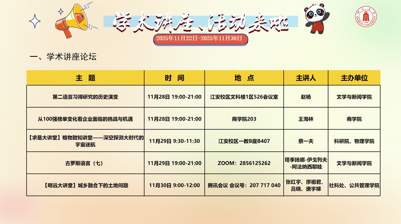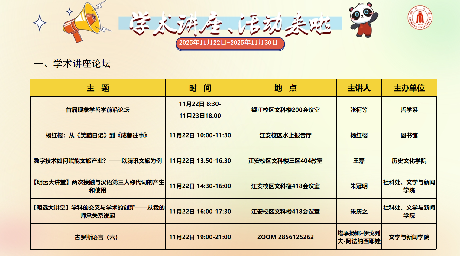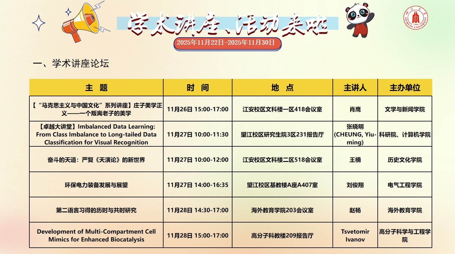 色漫网 2025年11月22日-2025年11月30日学术讲座和校园文化活动预告