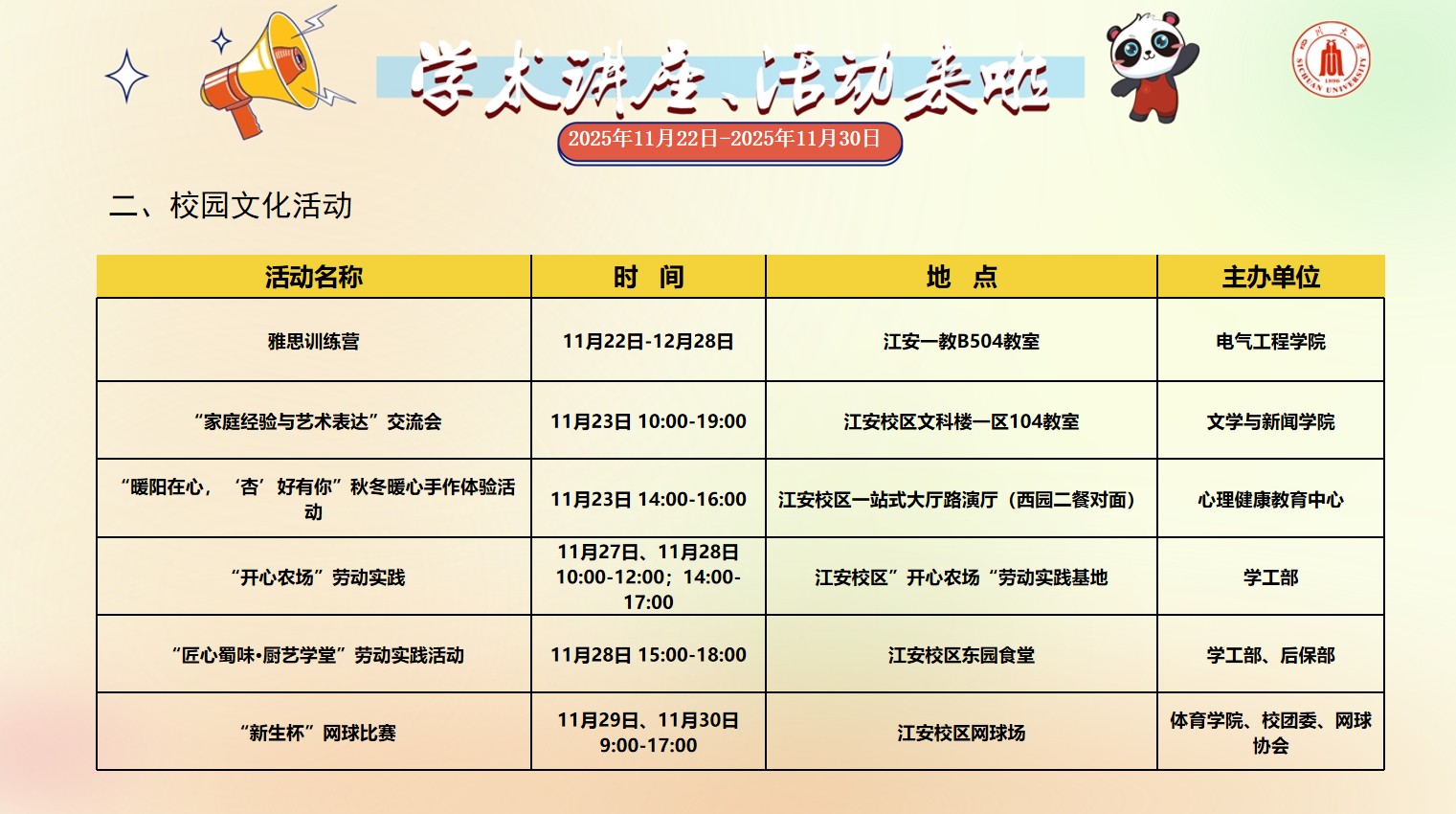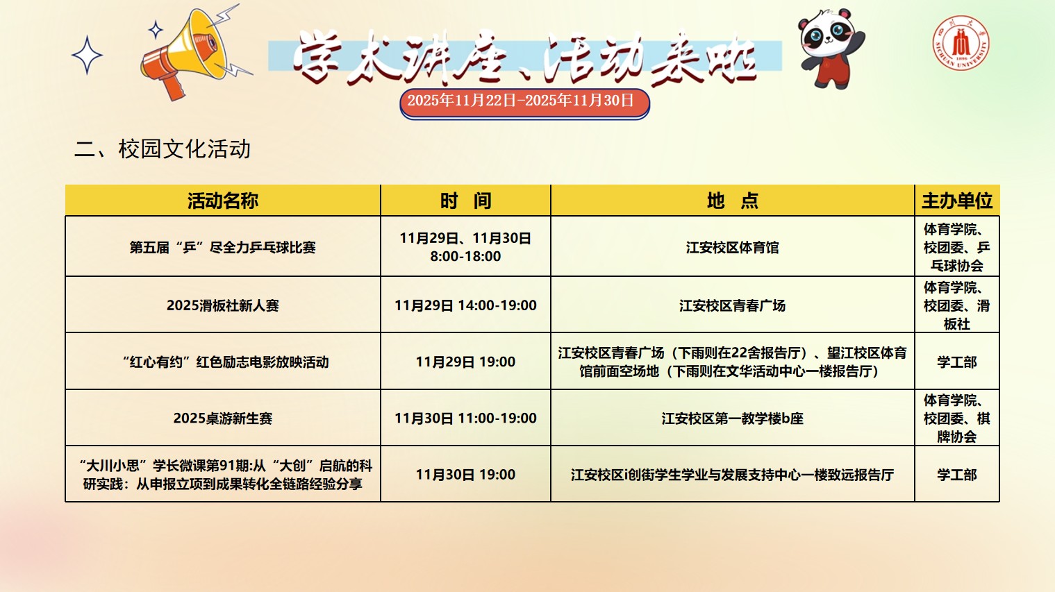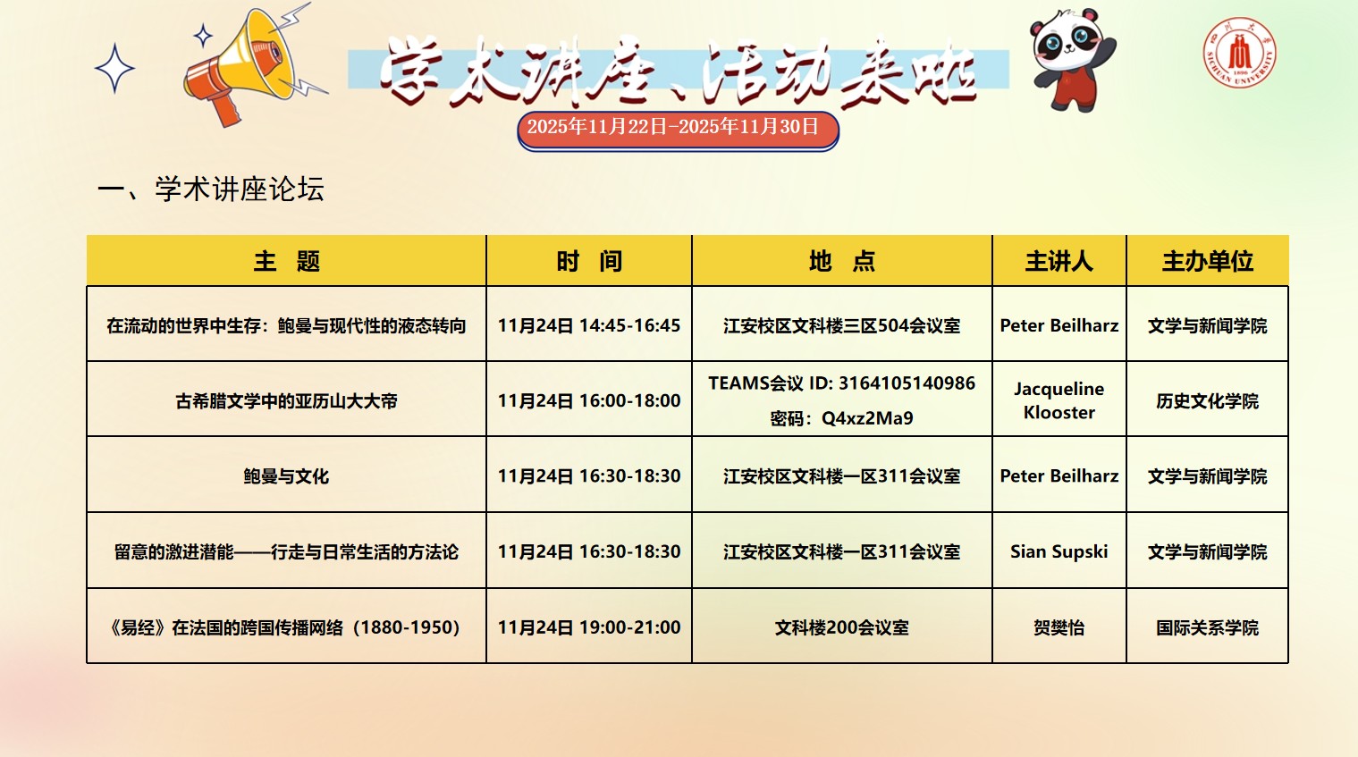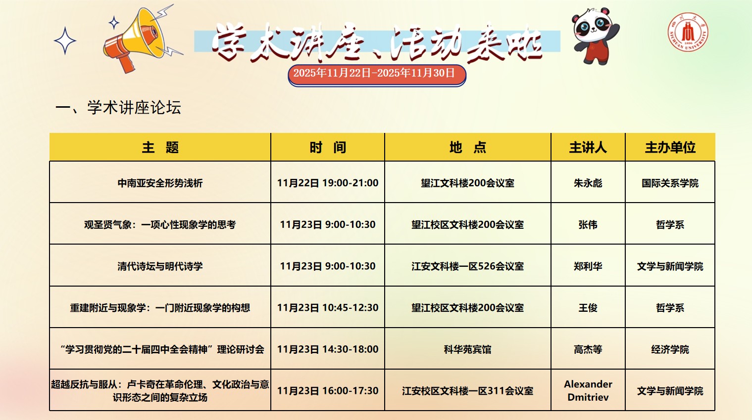 色漫网 2025年11月22日-2025年11月30日学术讲座和校园文化活动预告