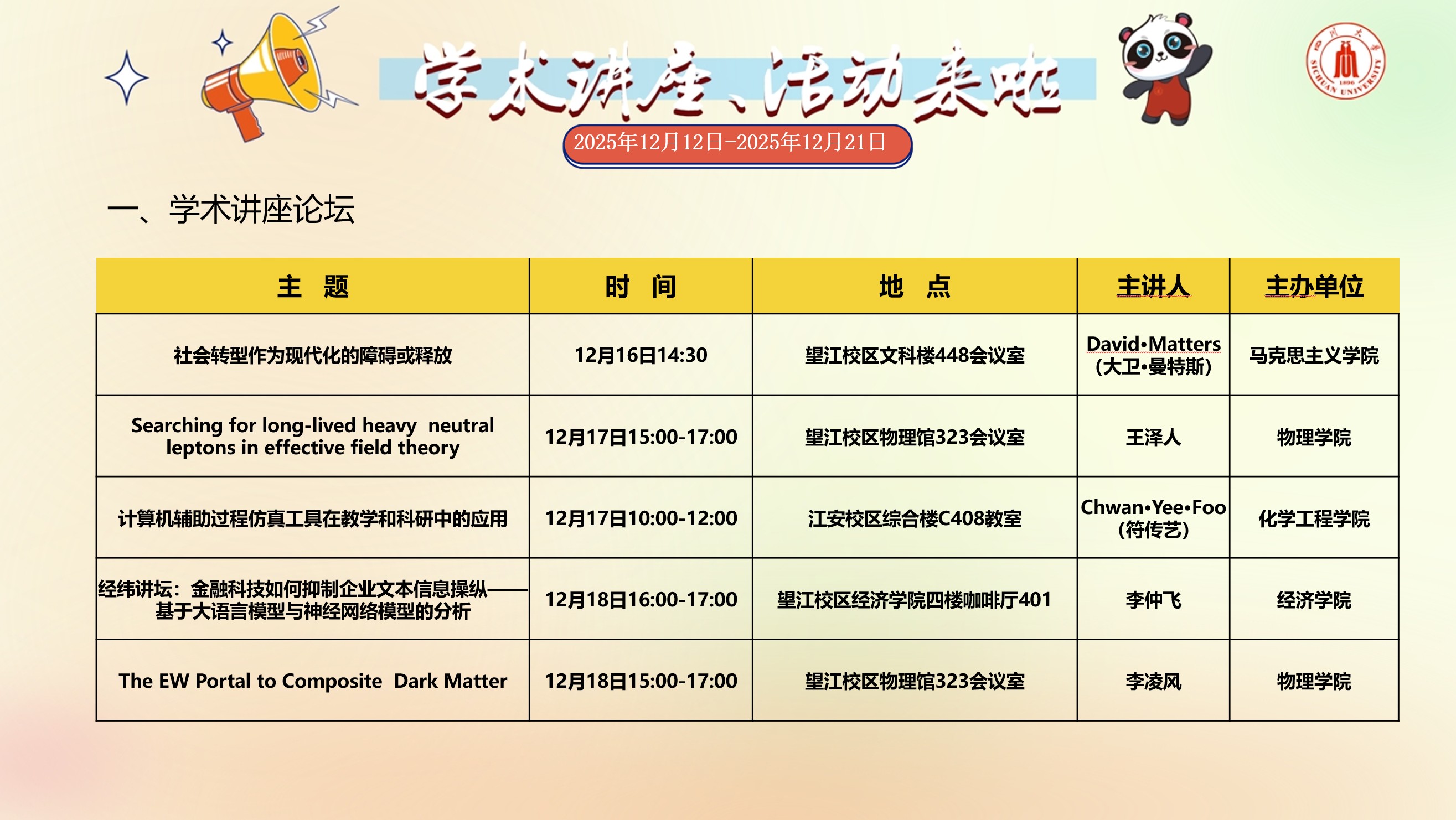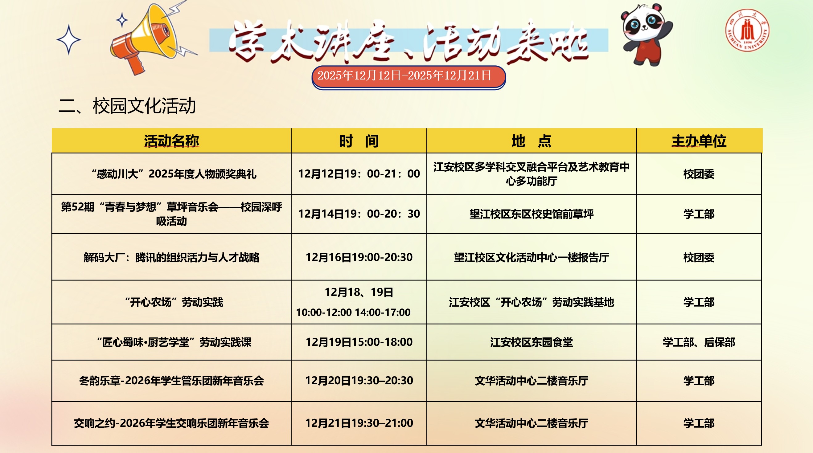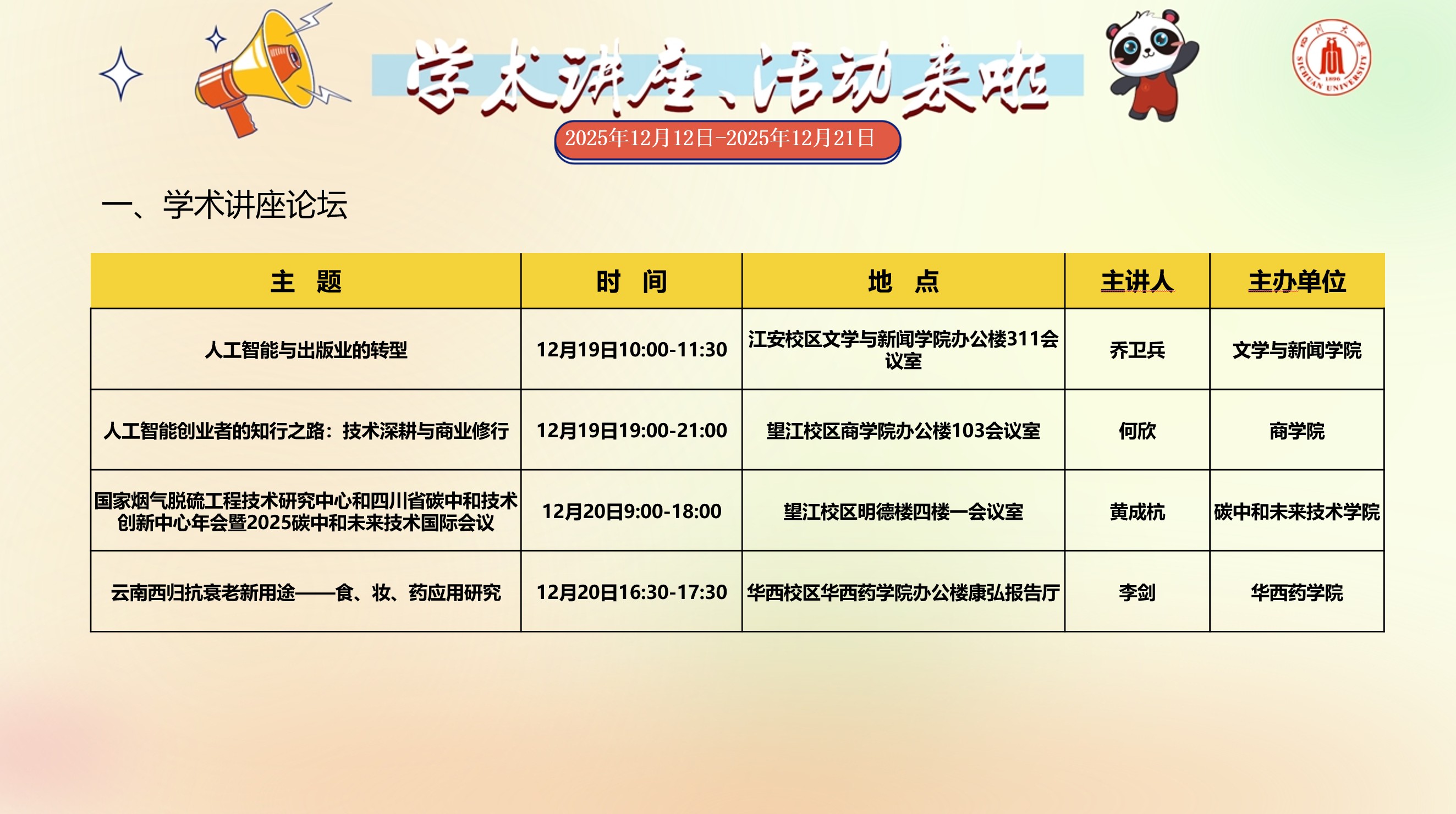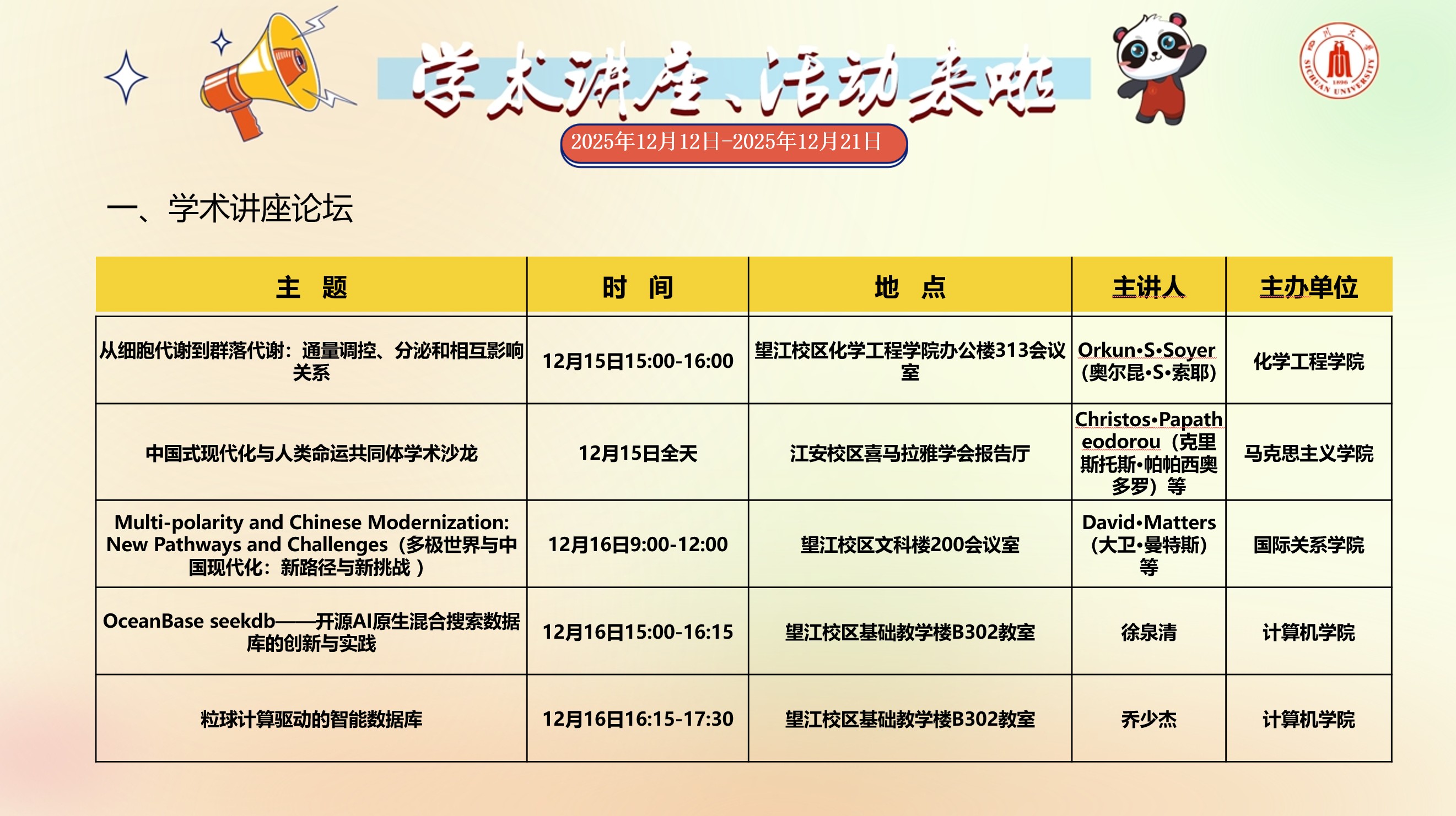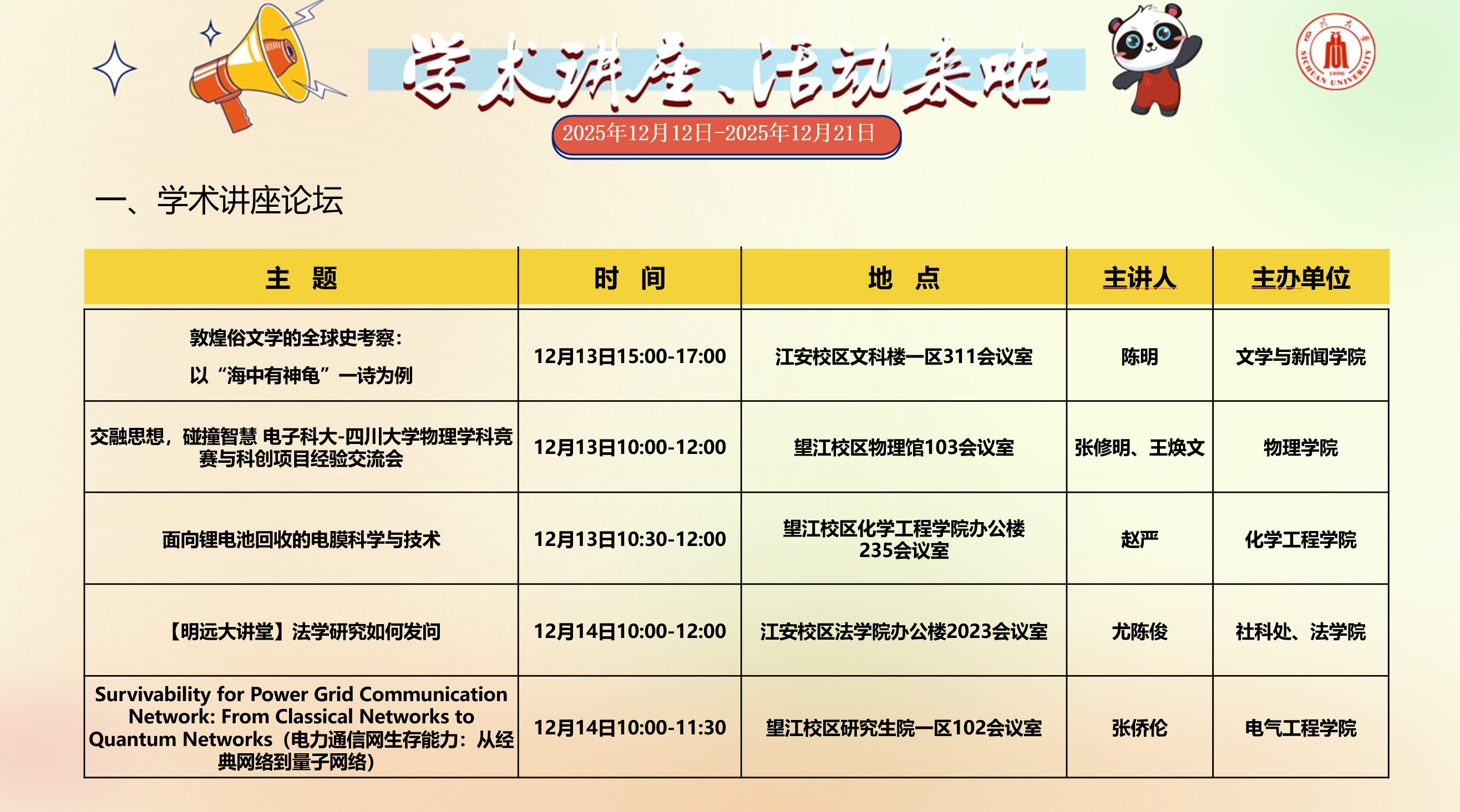 色漫网 2025年12月12日—12月21日学术讲座和校园文化活动预告