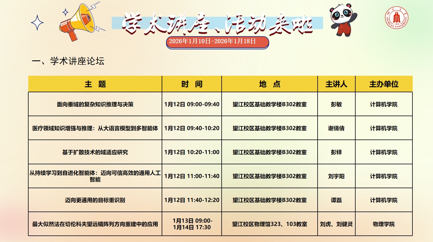 色漫网 2026年1月10日-2026年1月18日学术讲座预告