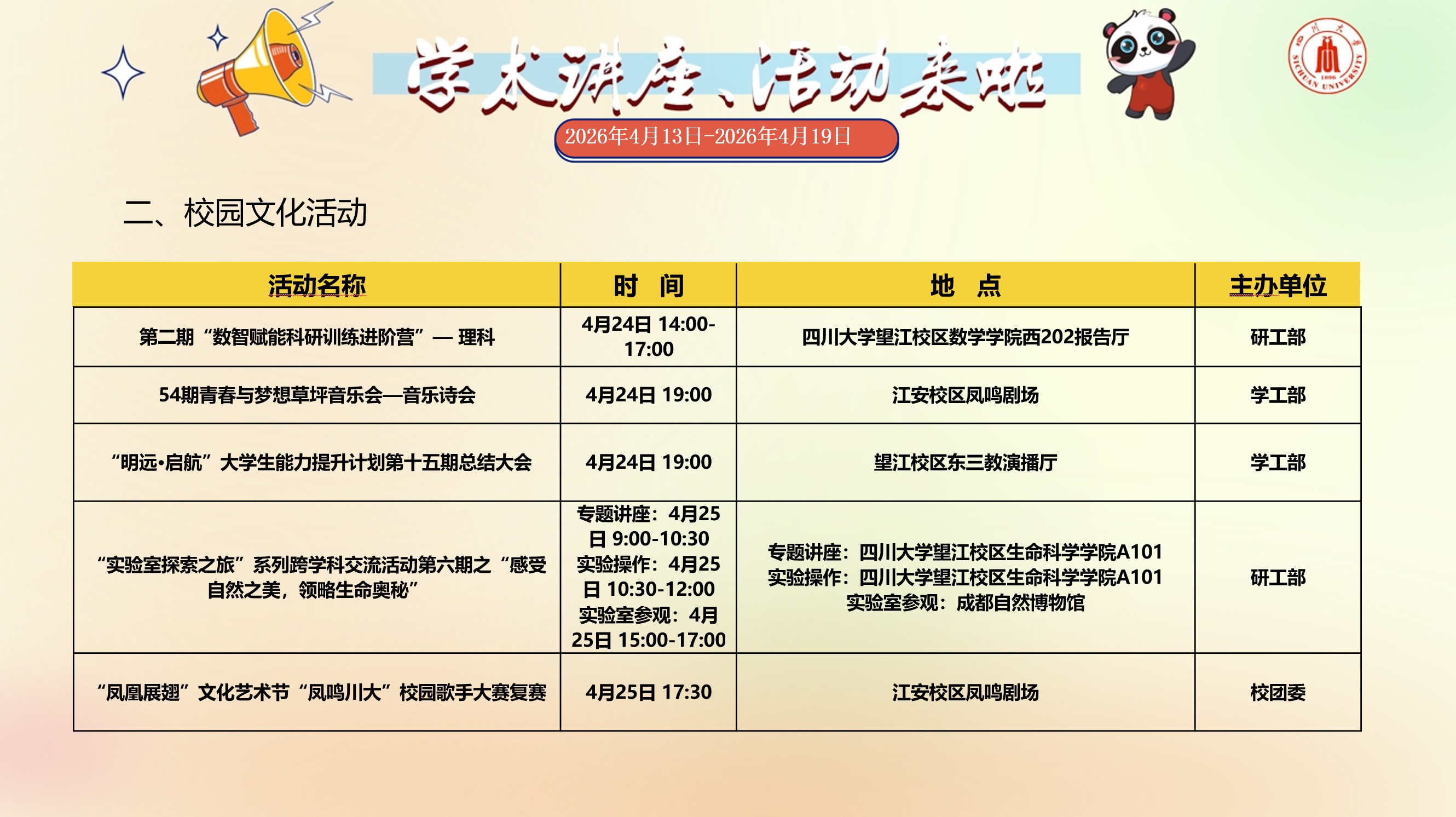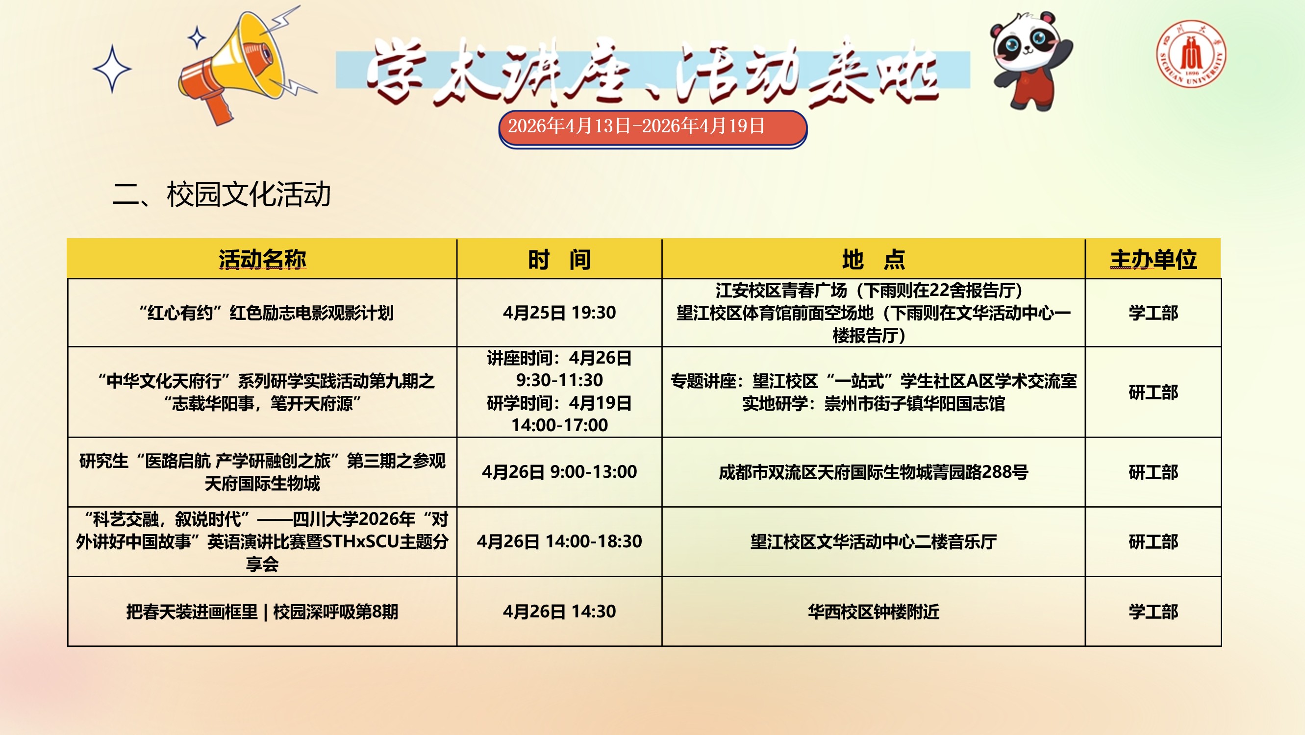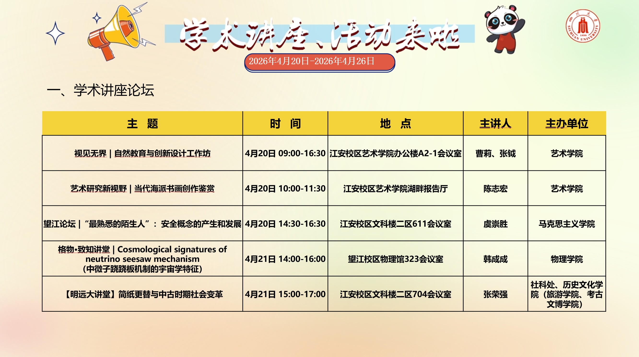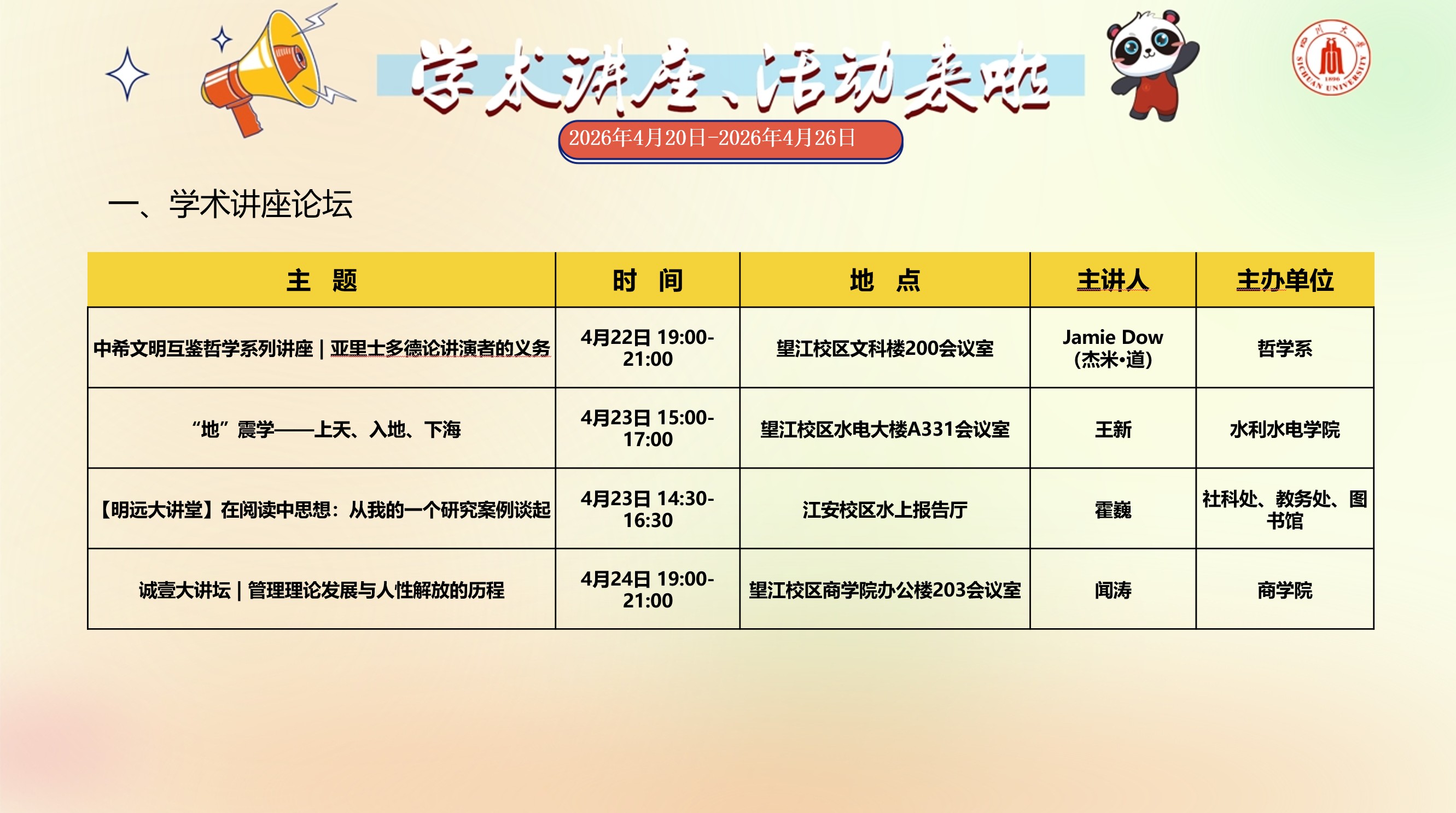 学术讲座与校园文化活动预告(2026年4月20日-2026年4月26日)