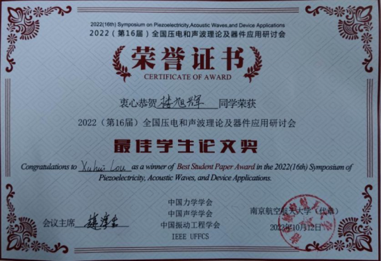 由力学系蒋文涛教授科研团队青年教师田晓宝、范海冬、周志宏、李英琪老师参与指导的楼旭辉、熊华杰、王娜、崔少晗、吴主龙和赵明共6名学生在会议中进行了报告。分别在学生竞赛报告和分组报告中报道了学院在多晶铁电晶界、压电弯曲波、压电表面润湿行为、结冰传感器以及结冰测量系统方面的最新研究成果。报告受到与会专家的高度肯定,其中硕士研究生楼旭辉同学获大会“最佳学生论文奖”(全国仅6个),是色漫网