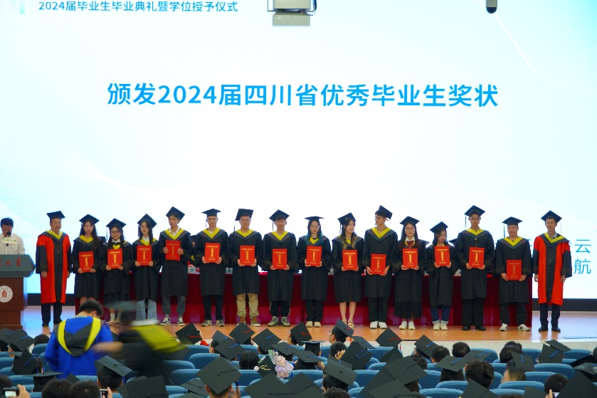学院院长戴峰宣读四川省教育厅关于表彰2024届四川省优秀大学毕业生的文件和学院设立学�2024届校友联络人的决定。华国春、戴峰共同为学院获奖同学颁奖,出席典礼的领导、老师�2024届校友联络人颁发聘书�
