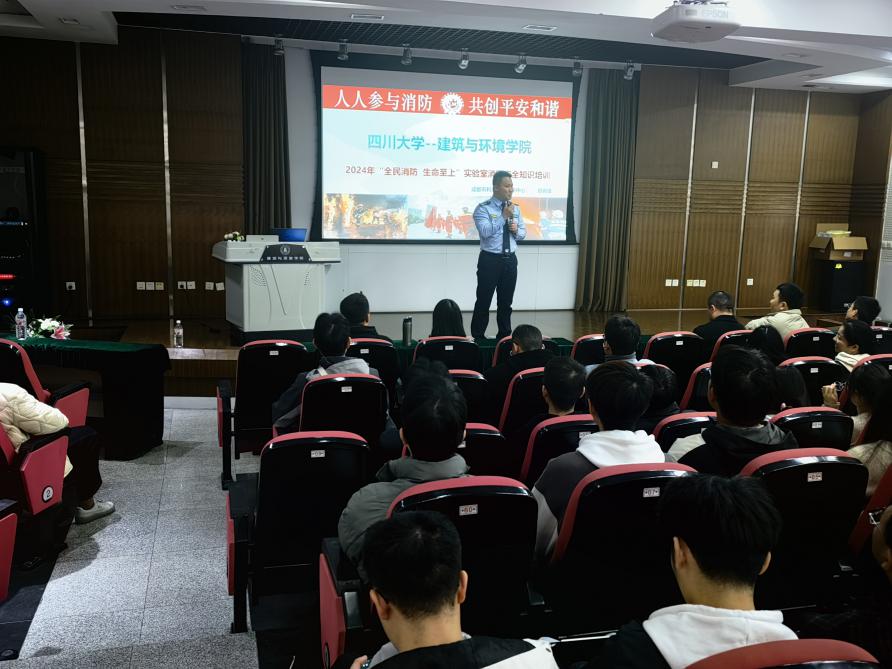 11月是学校的消防安全宣传月,为提升师生消防安全意识和防火自救能力,11月22日,学院在江安校区学院大楼二楼报告厅组织开展了实验室消防安全培训和灭火器适用实操,学院副院长刘敏主持此次活动,科研秘书、安全秘书、实验室负责人、教辅老师、研究生100余人参加,利民消防宣传中心郑克峰教官进行主讲。