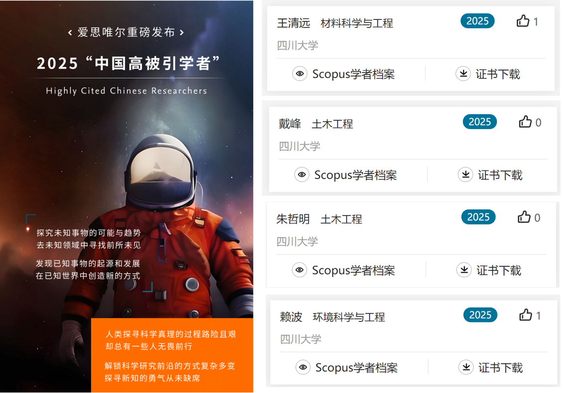 1月30日,爱思唯尔(Elsevier)正式发布2025“中国高被引学者”(Highly Cited Chinese Researchers)榜单。全国共有6310位学者入选,来自543所高校、企业及科研机构,覆盖了教育部10个学科领域、83个一级学科。学院共有4位学者入围该榜单,分别是王清远教授、戴峰教授、朱哲明教授、赖波教授,入选学科分别为材料科学与工程、土木工程、土木工程、环境科学与工程。