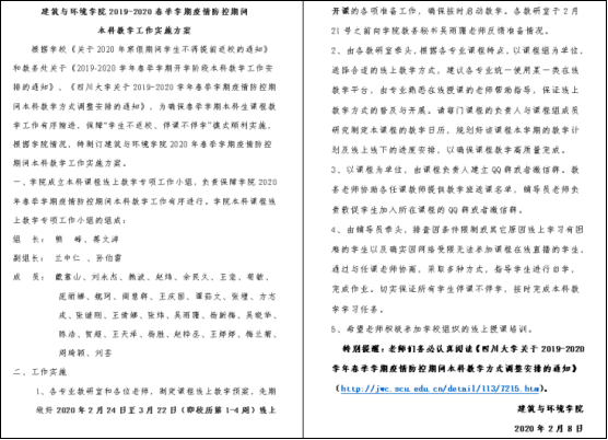 为确保线上教学万无一失,建环学院成立了本科课程线上教学专项工作小组,制定了《建环学院2019-2020春季学期疫情防控期间本科教学工作实施方案》,负责保障学院2020年春季学期疫情防控期间本科教学工作有序进行;与此同时,加快助教岗位配备工作,于2月12日,全面完成全院的助教配备工作。对所有助教实施线上教学培训,以更好地协助老师进行线上教学;此外,由学院出面,邀请精通网络及具有一定线上教学经验的老师为授课教师们开展了线上授课的直播培训,重点讲解了易为上手的腾讯课堂、腾讯直播间在线教学的全过程。建环学院对培训内容进行了录制,以电子形式免费发放给学院教师。