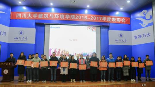 12月22日下午13:00,学院在江安校区水上报告厅举行2016-2017年度表彰大会。学院院长熊峰、党委书记蒋文涛、党委副书记王晖、副院长兰中仁、副院长刘敏、副院长李沄璋、教导员罗从政、环境系副系主任江霞、土木系副系主任丁志斌、力学系副系主任刘永杰、建筑系副系主任毛颖、四川瑞信实业集团有限公司总经理助理兼项目总经理董志全、四川瑞信实业集团有限责任公司人力资源部负责人罗甜出席本次表彰大会。学院全体辅导员、获奖学生代表及全体2017级同学参加表彰大会,表彰大会由学院党委副书记兼纪委书记孙伯雷主持。