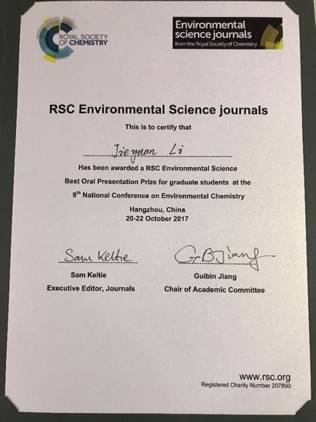 2017年10月19日-22日,由中国化学会主办,浙江大学承办的“第九届全国环境化学大会”在浙江杭州举办。该会议是全国范围内规模最大、参会人数最多、影响力最广的环境学科会议。会议设置了研究生报告分会场,我院博士研究生李解元在1000多位申请者中脱颖而出,得到组委会的报告邀请,作了优秀报告,并获评由英国皇家化学会赞助提供的“优秀口头报告奖”。