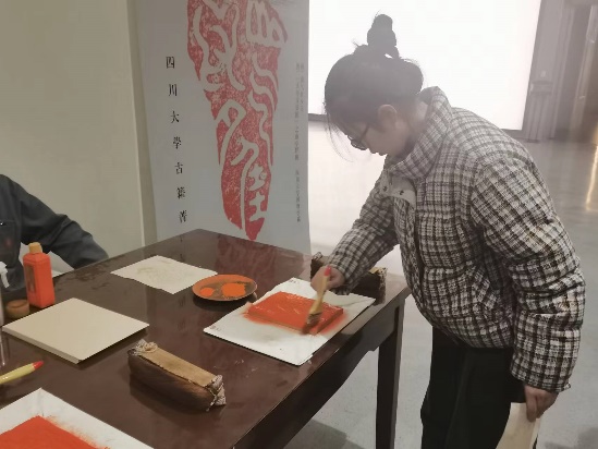 该展览分三个单元展示和讲述古籍背后的故事,在讲解员的导览下,大家从不同的角度学习和感受典籍的艺术魅力和美育价值:“书史撷珍”以时间为线索,介绍古籍的发展脉络,展示其风格迥异的时代风貌和形态各异的版本特征;“蜀黉芸编”以书籍为媒介,呈现川大前辈先贤对蜀学传承的不懈努力;“艺韵千年”聚焦古籍中的美学元素,呈现古籍中俊逸的书法、细腻的描绘、传神的雕刻,展现了华夏文明的和谐大美。此外,在沉浸式文化体验区,大家亲手操作、体验古籍雕版印刷、手工传拓技艺、古典诗句摘抄和展览元素印章打卡,在生动有趣的体验中感受古籍之美。