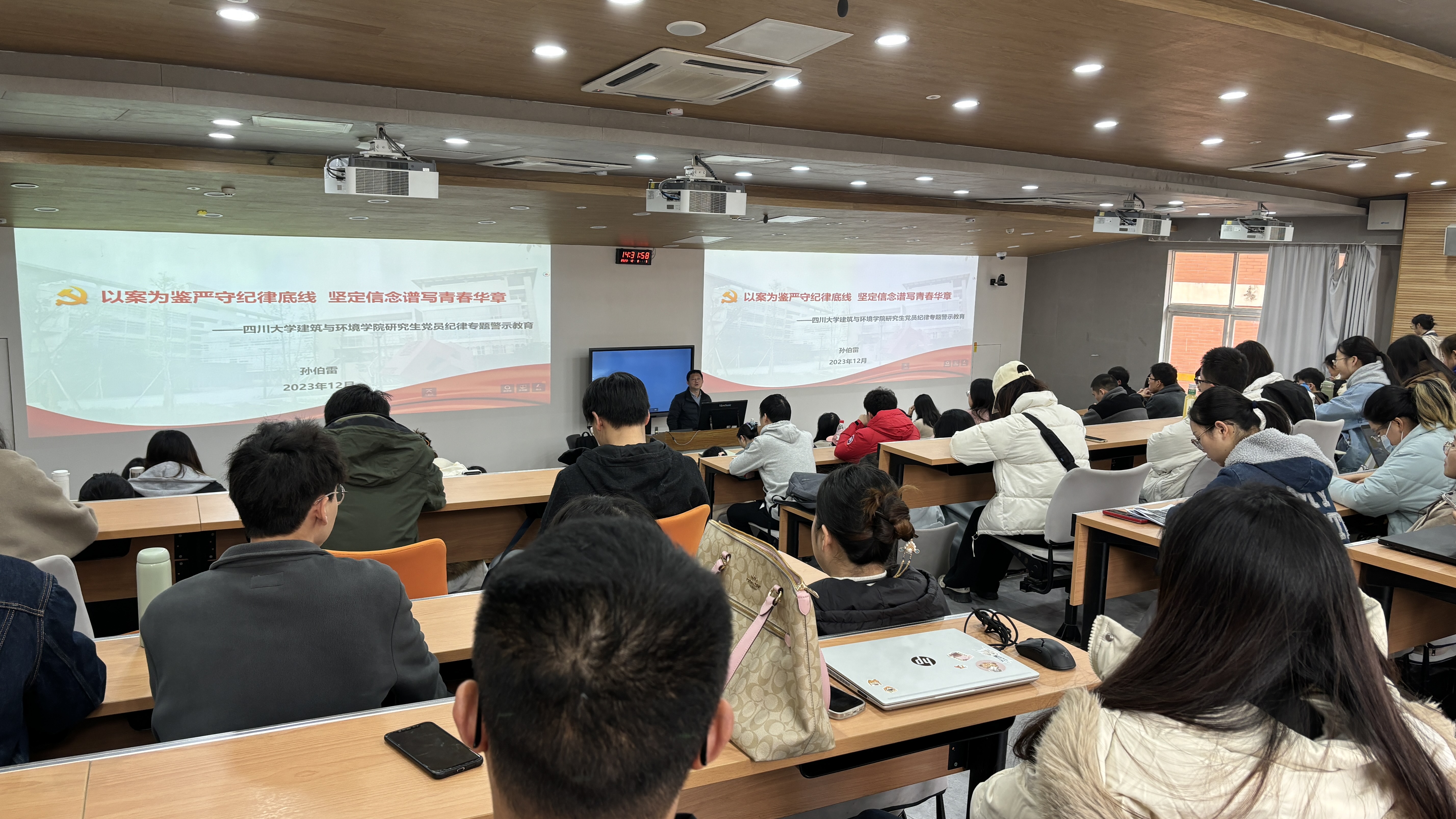 为进一步强化和推进学院研究生党员队伍建设,切实提高研究生党员的先进性和纯洁性,时刻筑牢信仰之基、绷紧纪律之弦,12月8日下午,学院在望江校区基础教学楼C101教室,举办了研究生党员纪律专题警示教育学习会。学习会由学院党委副书记兼纪委书记孙伯雷主讲,学院研究生辅导员、研究生党支部书记和望江校区研究生党员共计120余人参加了此次警示教育学习会。