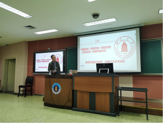 的历史沿革,讲述了各校区的校园空间演变历程、标志性建筑的昨日今生,针对校园现存问题进行了客观理性的分析,对未来校园规划进行了周到细致的讲解。结合校史,刘东昭对以江竹筠烈士为代表的川大革命志士的“进取精神、担当精神、革命精神、牺牲精神”进行了阐释,鼓励同学们认真学习、忠于理想、坚守信仰,争做引领社会的时代弄潮儿。他将校园建筑史、校史升华到党史、国家民族史,并结合亲身经历与感受,在回顾过去的同时展望未来、期待明天。最后,刘老师对同学们关心的问题进行了剖析解答。