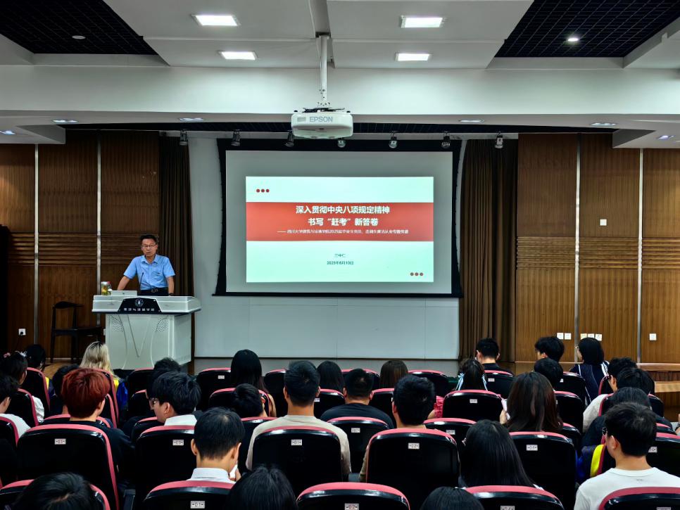 6月10日,学院党委书记兰中仁以《深入贯彻中央八项规定精神,书写“ 赶考”新答卷》为主题,为学院2025届毕业生党员、选调生讲授了专题党课。党课以党的作风建设历程开篇,详细阐释了中央八项规定和中央八项规定精神,以违反中央八项规定精神的典型案例强化警示教育。同时,兰中仁注重强化榜样引领作用,以学院优秀校友的先进事迹勉励毕业生们不断锤炼党性修养、严格自我要求、写好时代答卷。