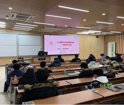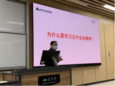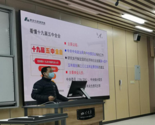为全面贯彻落实习近平新时代特色社会主义思想和党的十九届五中全会精神,引导学生主动学习十九届五中全会精神,积极关注时政热点,提升政治素养,学院党委书记蒋文涛教授于12月9日在江安校区综合楼C座307教室给2020级同学上了一堂十九届五中全会精神导读思政课。