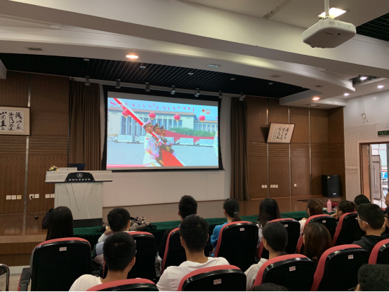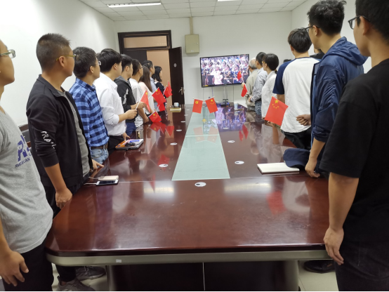 大会开始前,“庆祝中华人民共和国成立70周年”纪念章获得者、力学系退休教授宁交贤同志早早来到望江校区建环学院130-1会议室,建环学院党委书记蒋文涛同志、党委副书记王晖同志与宁教授亲切交流,询问他的身体状况,祝贺他获得纪念章。宁教授在观看视频前与大家一起分享了他参加革命70年的故事。当大会中奏响国歌,130-1会议室观看视频的师生全体起立,挥动着国旗,齐唱国歌,表达他们对祖国母亲的热爱与深情。