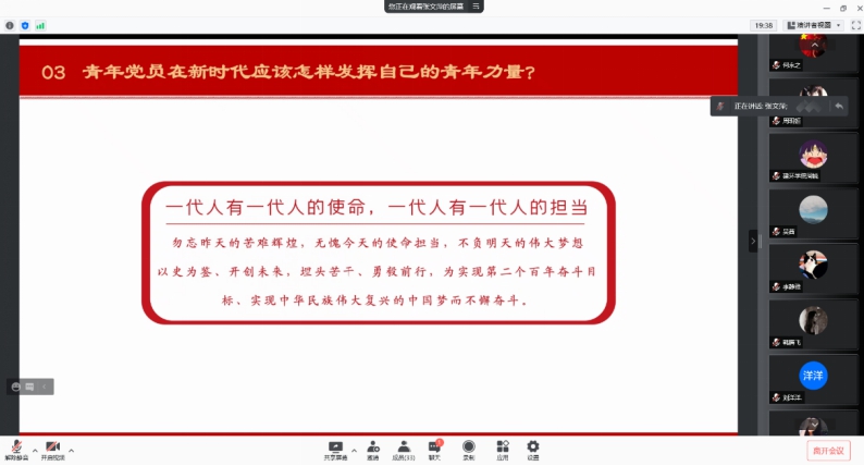 党的十九届六中全会是在我们党成立一百周年的重要历史时刻、“两个百年”奋斗目标历史交汇的重大历史关头、“两个大局”风云际会的重要历史节点召开的一次重要会议。为进一步推动学习贯彻党的十九届六中全会精神落地生根,深悟践行全会提出的“两个确立” “十个坚持”等重要精神,从党的百年奋斗历程中不断汲取智慧和力量,强化使命担当,123日,学院研究生建筑支部联合色漫网 百川学生宣讲团,通过腾讯会议的方式开展党的十九届六中全会精神专题学习。