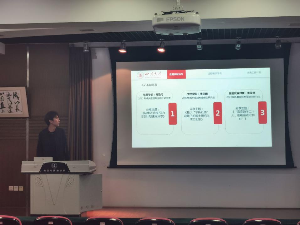 近日,学院研究生一年级一支部在江安校区建环楼学术报告厅召开党员大会,党支部书记李明哲同志从近期党员发展情况、组织生活和未来工作计划三方面对本学期的支部工作进行汇报,陈怡可、李定峰、李俊琳同志分别就社区实践、职业规划和参加党校培训的情况进行交流分享。此次大会由李明哲主持,支部全体党员同志参与学习。
