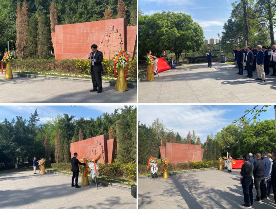 随后,教师党员向先烈默哀并敬献花篮,学院工会主席楚英豪和专职组织员廖光明为祭献的花篮整理缎带。由学院党委副书记兼纪委书记孙伯雷带领,全体教师党员重温入党誓词。