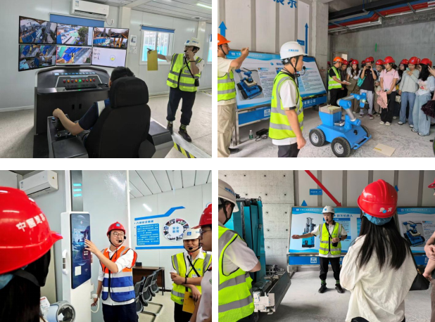同学们深入一线,在数字全景塔机集控驾驶舱前,亲眼见证地面操控实现高空精准作业的行业革新场景,直观感受智能技术对传统施工模式的重塑;在智能施工展区,近距离接触自动贴砖机器人、墙面抹灰机器人等机器人天团,体验智能安全帽等“黑科技”的实地应用,切身感受现代建筑业“智能化、绿色化”的转型趋势,对“科技赋能建造”的行业发展路径有了更深入的认知。