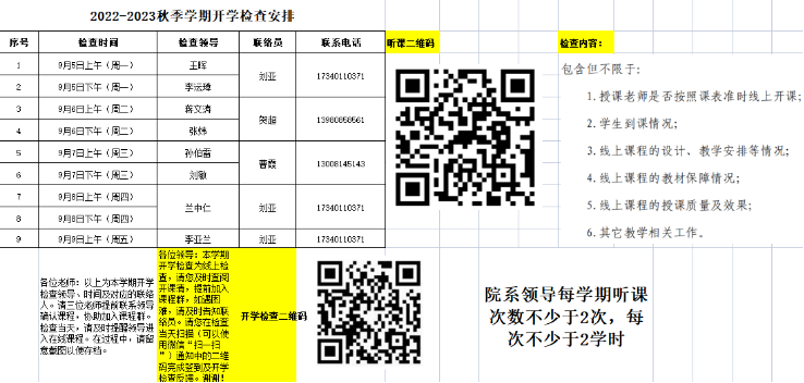 关于调整新生报到、学生返校时间的通知》要求,我院在2022—2023学年秋季学期第二教学周开始全面开展线上授课,并根据学校关于开展开学教学检查工作的文件精神和工作要求,组织学院领导班子、学院教学管理人员、辅导员、教学督导人员对学院线上教学工作安排、课堂开展状况、教材保障及选用情况等进行了全方位检查。