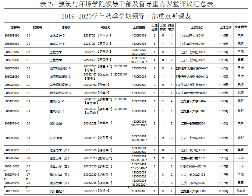 院长,书记,教学副院长,学生副书记,其他院领导,各系主任,副主任,教研室主任及副主任和学院督导组累计听课200余门次,听课范围覆盖全院各专业各年级,课程覆盖全院必修,选修,品牌课程,通识课程及新开课程,具体统计如下表显示。
